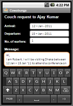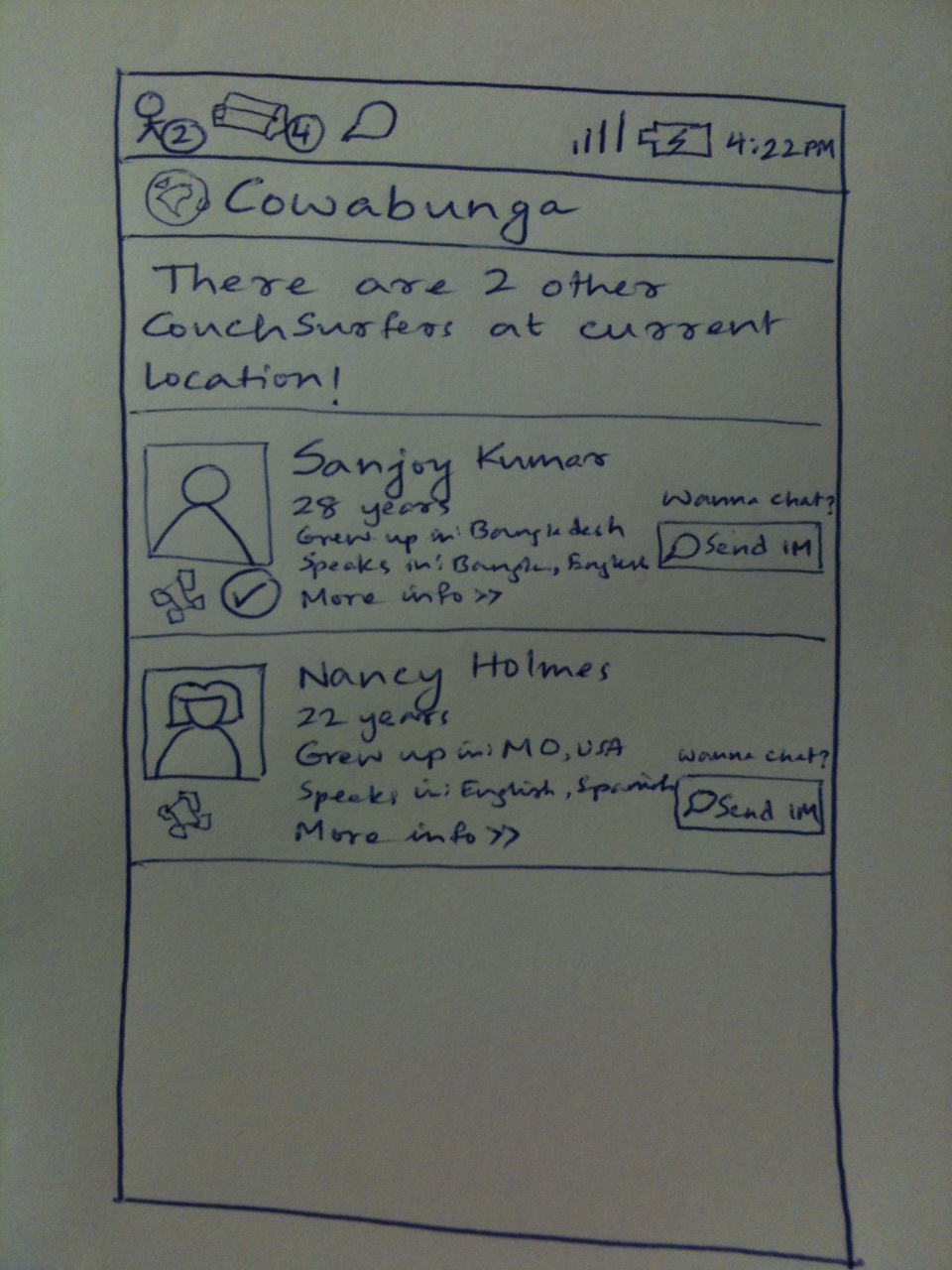 As the team lead for this project, I was responsible for literature review, running a Facebook ad campaign for recruiting couchsurfing community members, co-ordinating with couchsurfers from six countries for scheduling interviews and testing, creating low-fidelity and mid-fidelity prototypes conforming to Android interaction paradigm, conducting remote usability tests followed by data analysis. I played a key role in the group exercises of affinity diagramming, scenario creation and user interviews.