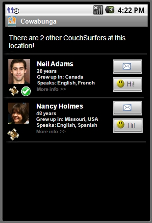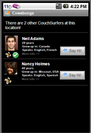 We are proposing Cowabunga!, a mobile application which augments multi-cultural exchanges instigated by an online hospitality exchange community called CouchSurfing.org (CS). By facilitating chance meetings that would not happen otherwise, our solution is helping people get spontaneous exposure to others with whom they may have nothing in common except their CS membership. Cowabunga! has been created through an iterative user-centered design process and bears a great potential of promoting diversity. The feedback we received suggested that such a complement to the CS platform is both interesting and has novel utility and is thus conducive to increasing cross-cultural awareness.